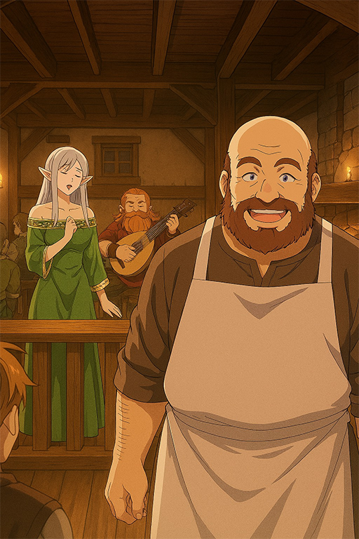 Ao entrarem na estalagem foram recebidos por um cheiro de boa comida caseira que os fez se lembrarem que estavam com fome e com uma harmoniosa música cantada por uma cantora élfica que era acompanhada por um anão tocando um alaúde. Um senhor forte, levemente barrigudo, barbudo e calvo que vestia trajes simples e que usava um avental impecavelmente branco por cima deste (e que eles depois descobriram ser o dono da estalagem) veio ao encontro deles com um amigável sorriso no rosto.