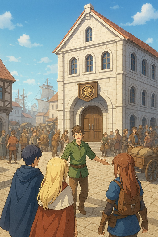 No dia seguinte, após um farto café da manhã o grupo seguiu, guiado por um funcionário da estalagem, até à sede da guilda de comércio local. O prédio que servia como sede desta era um prédio de três andares, construído junto do porto, um misto de um grande galpão com um prédio de escritórios e contrastava com o resto da cidade: era claro, todo construído em pedras brancas e o grande número de pessoas que entravam e saíam de suas portas e o grande número de carroças que saiam de seu setor de cargas fazia este emanar uma vida, uma sensação de calor humano que eles só tinham visto na hospedaria onde estavam hospedados.
