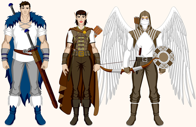 A descrição da roupa do Marcelo: “Marcelo agora vestia botas de couro, uma calça larga de algodão tingindo de marrom, uma blusa branca rente ao corpo que disfarçava o fato dele usar uma cota de malha fina por baixo desta, uma mini capa marrom que só tapava os ombros e que possuía um capuz com um forro para proteger a boca (segundo Seg, servia de proteção para quando estivesse voando ou, como comentou debochadamente Lucca, servia para ele não engolir moscas no ar) e trazia, preso no braço esquerdo, um mini escudo de madeira. Além disso, trazia uma adaga presa na cintura, uma aljava adaptada para ficar entre as suas asas e um arco dobrável também preso na cintura”.