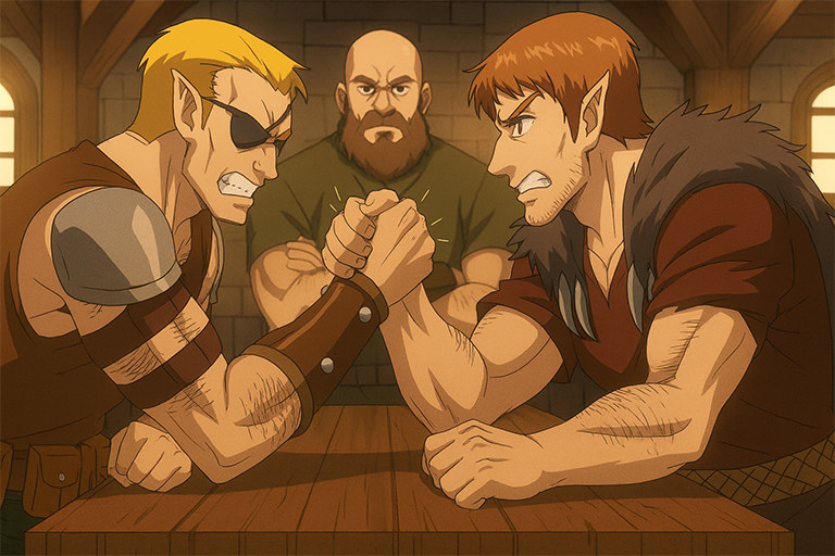 — Acredito que a jovem discorde. Mas não vamos criar um caos. Venho tentando aprender a solucionar as coisas de maneira mais pacífica. E como vejo que és um jovem forte e, imagino eu, orgulhoso de vossa força, que tal resolvermos tudo numa queda de braço, simples e amistosa?